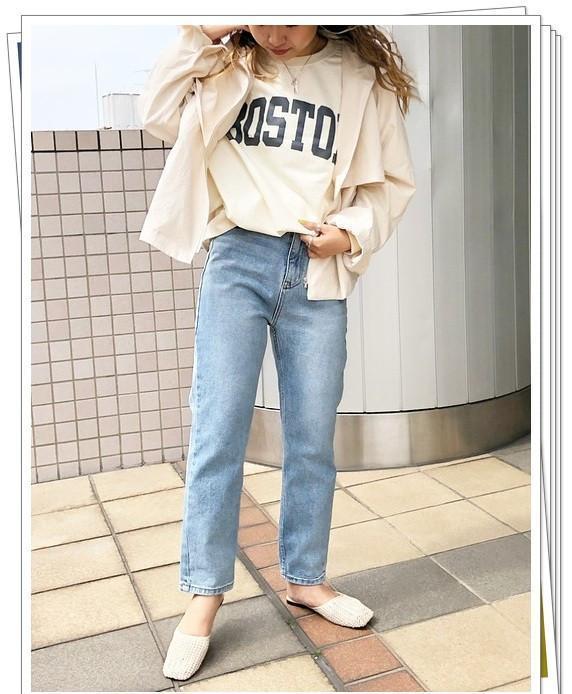 醒目的字母设计运动衫,简答搭配牛仔裤,完成美式休闲风。米白色的轻薄外套和方头的穆勒鞋让你的造型多了一些轻熟女人味。