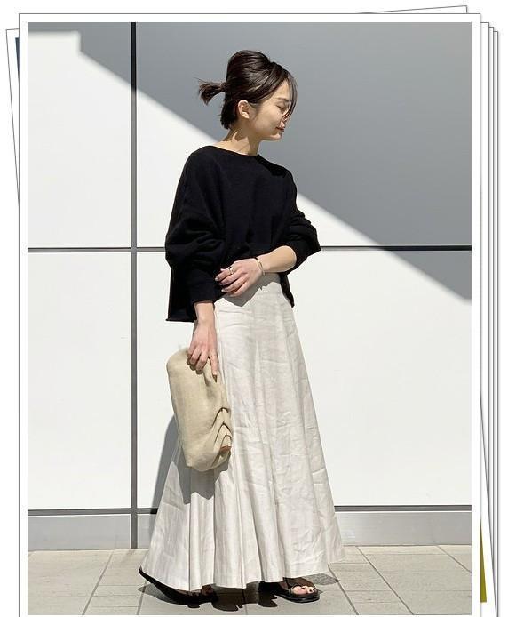宽松的黑色运动衫很适合轻熟女性的日常穿搭。它也与喇叭裙搭配得很好。选择一条明亮的米色棉麻长裙,用来打造具有自然气息舒适造型。
