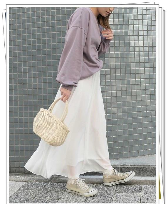 Oversize的运动衫和白色雪纺裙的搭配营造出适度的甜美穿搭感。用米色的帆布鞋来完成具有轻熟风格的舒适造型会很好。