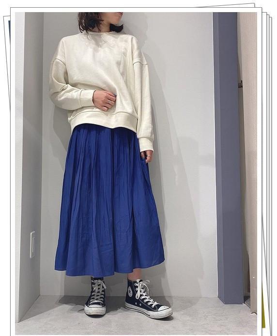 蓝色喇叭裙和白色运动衫相结合,带来春天般的清新穿搭感。高帮帆布鞋也是一种不错的选择。